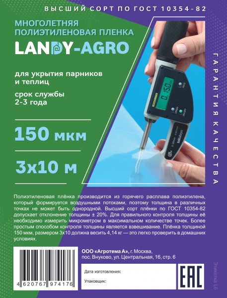 - «Парниковая прозрачная пленка Стандарт» соответствует высшему сорту по ГОСТ 10354-82, что означает разнотолщинность в пределах 20%. Эта пленка отличается наличием маркировки метража по всей длине. Аккуратные цифры напечатаны через каждый метр, создавая удобство при продаже в размотку и давая возможность моментального контроля остатка пленки в рулоне.